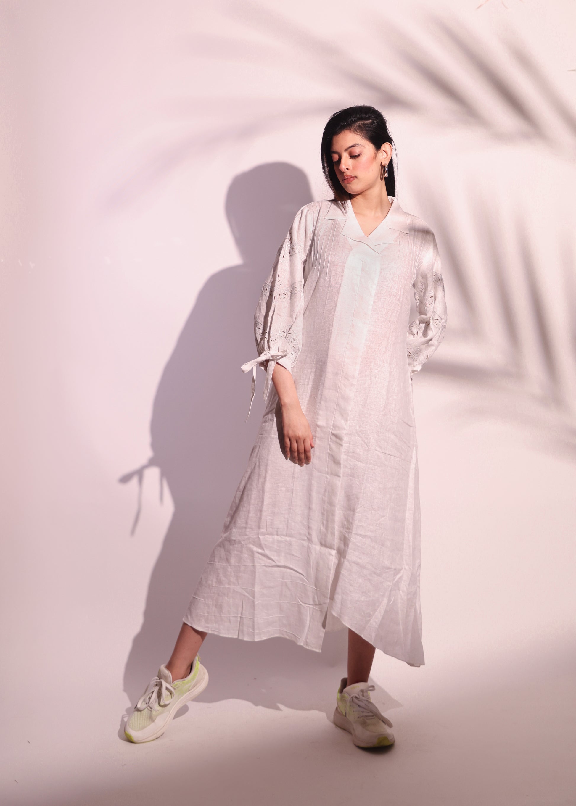 - Care Instructions: Dry Clean Only, preserving the pristine quality and crispness of the white linen.