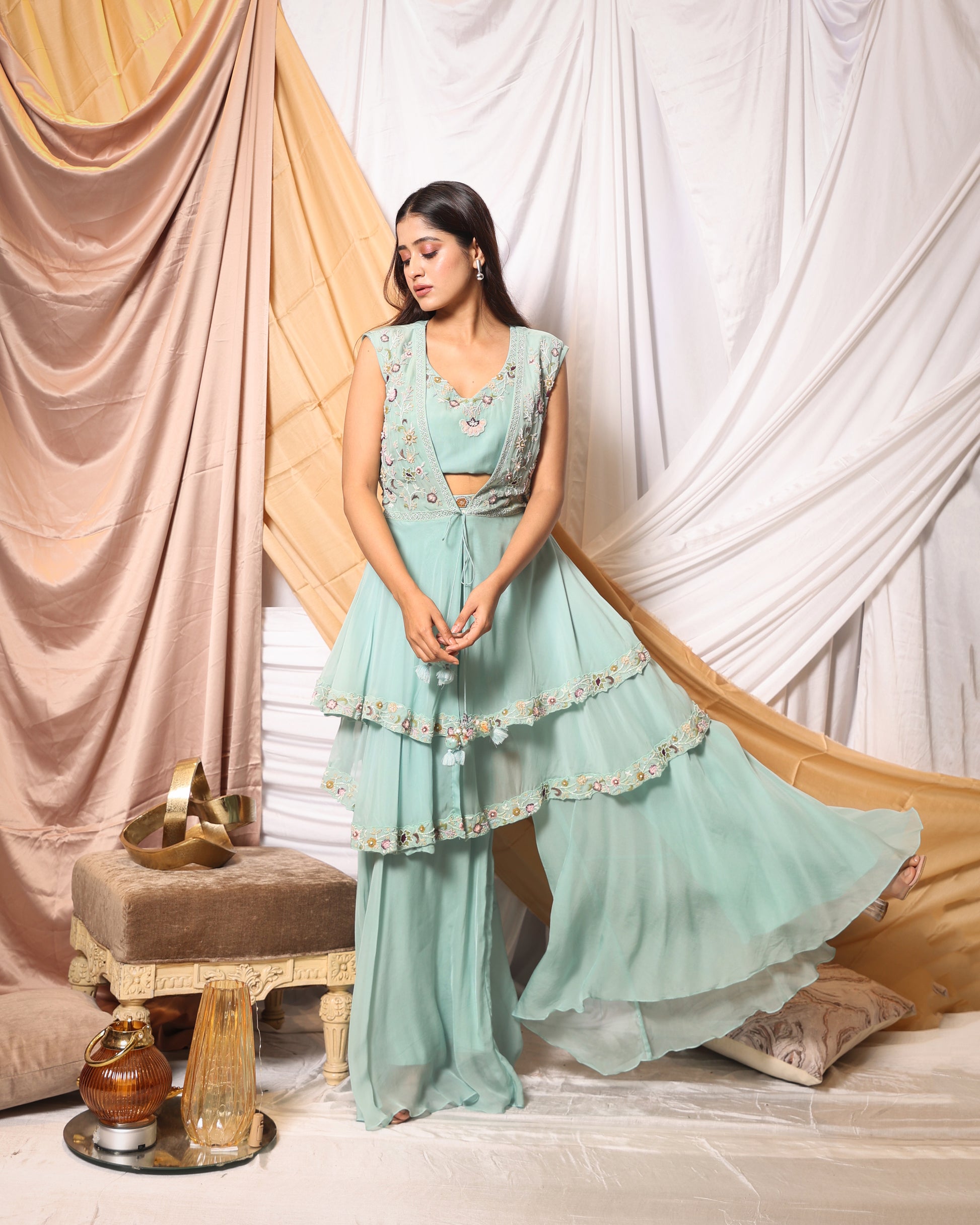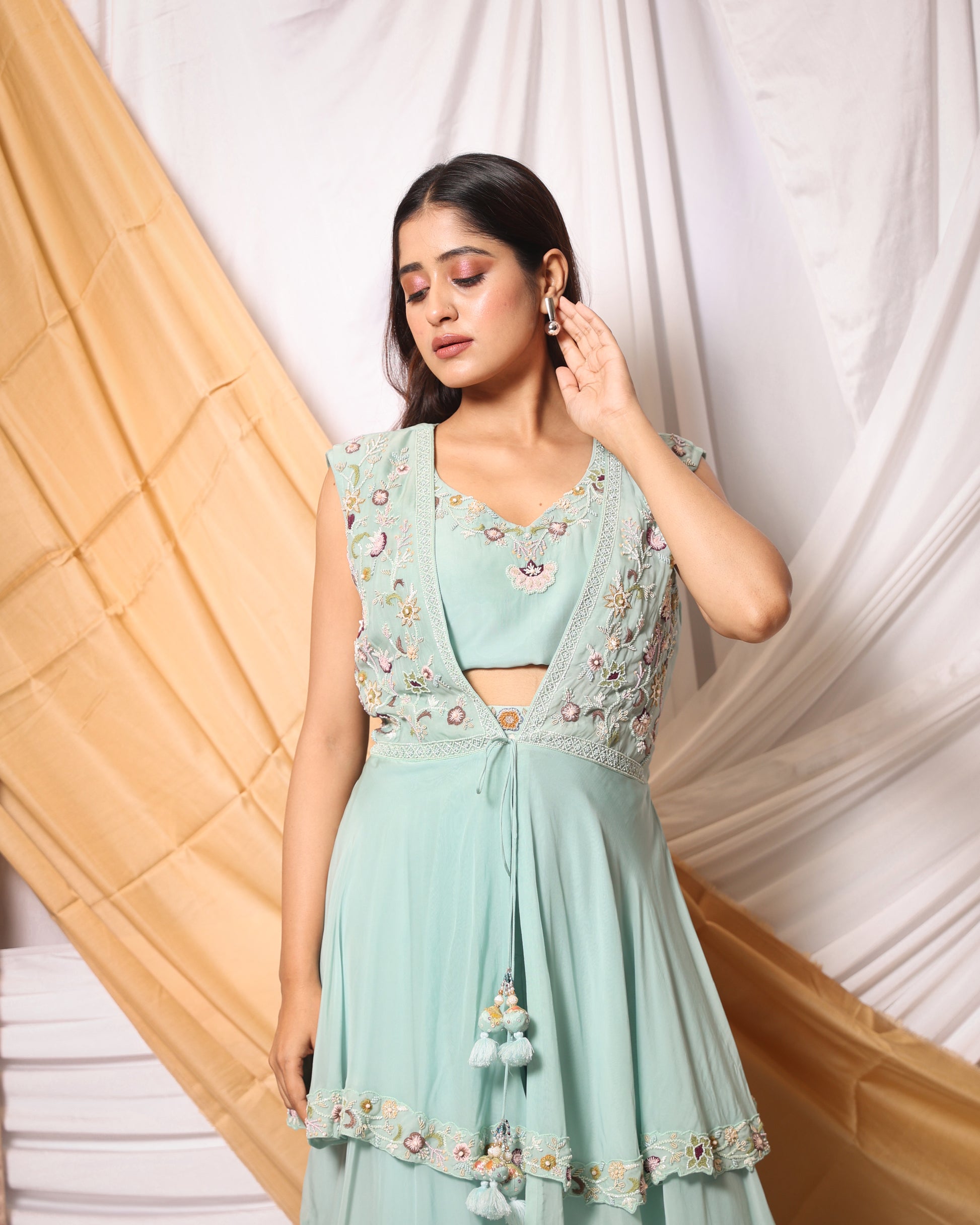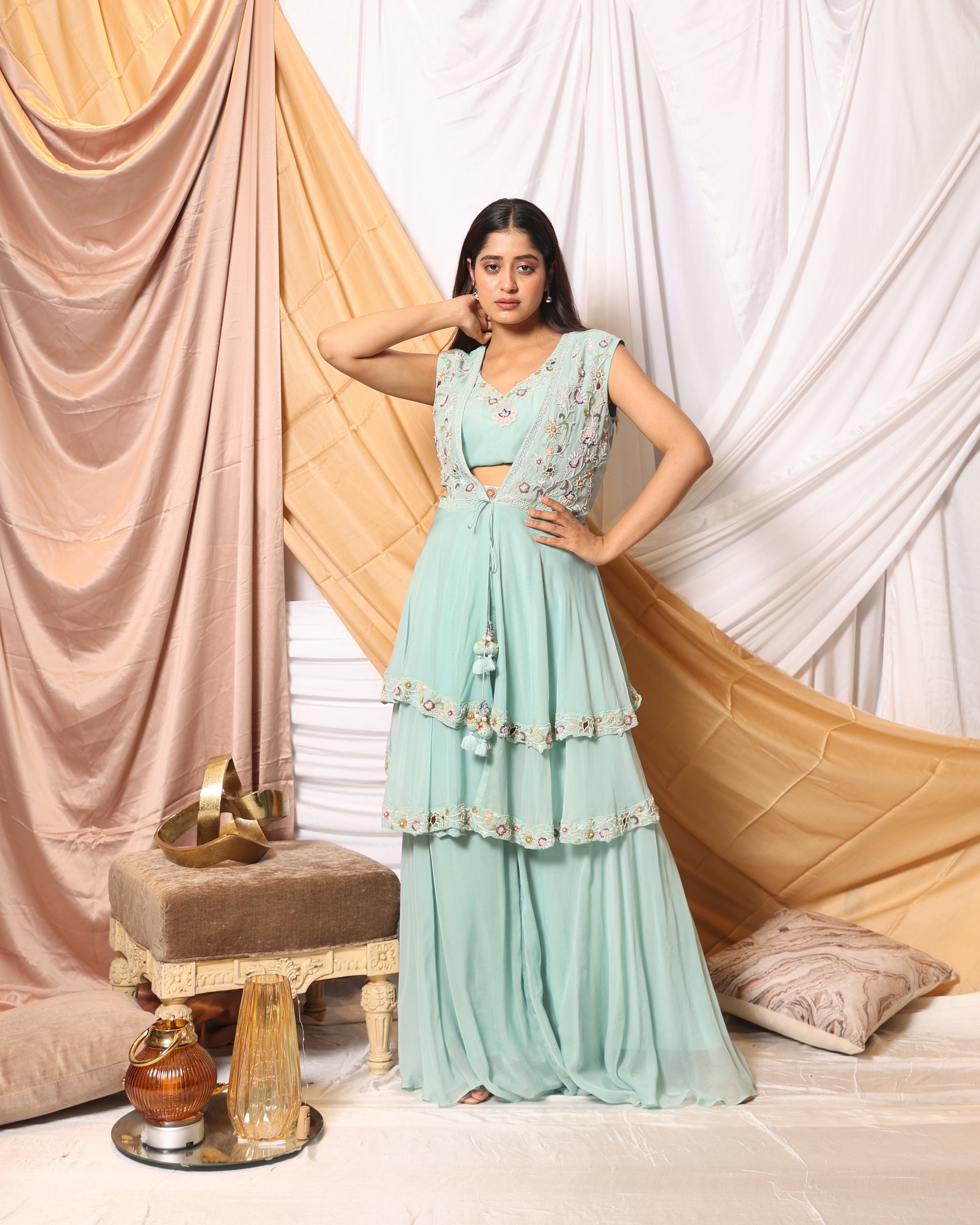 Elevate Your Wardrobe with Our Aqua Blue Embroidered & Layered Jacket Set Today!