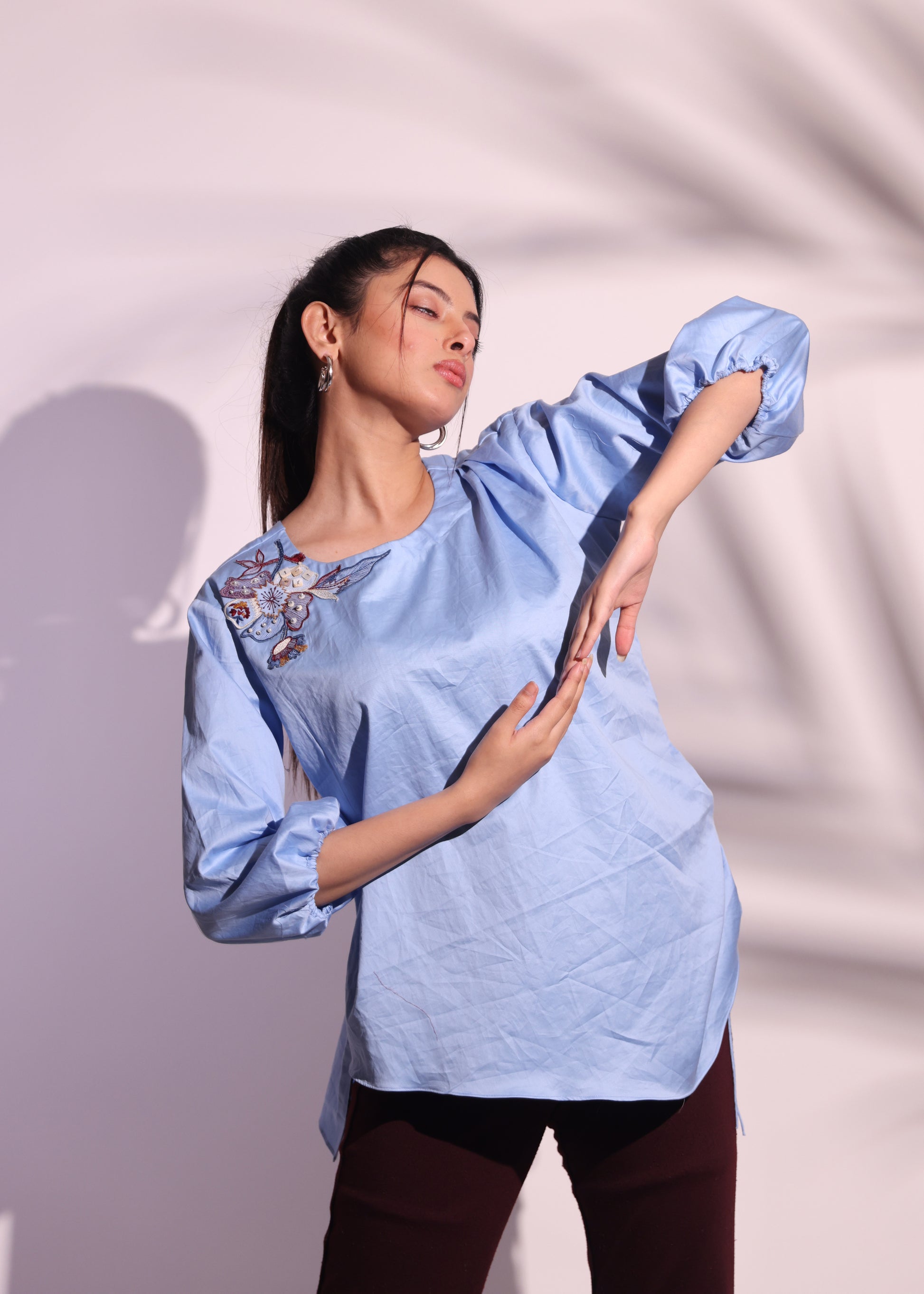 FLOWER EMBROIDERED SHOULDER PATCH SHIRT