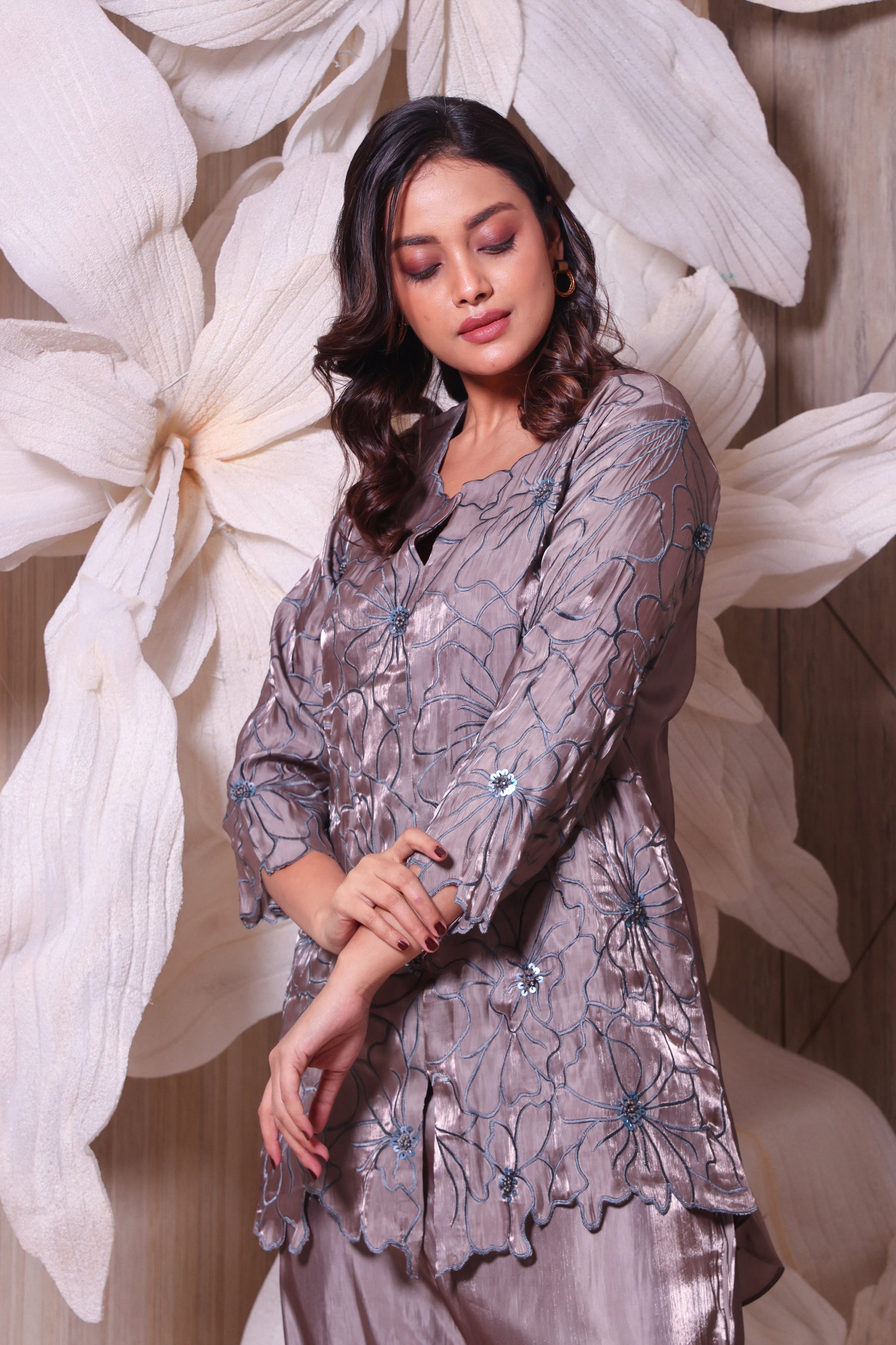 Delicate yet defined, this set includes a graceful tunic and matching straight pants—crafted for those who appreciate subtle elegance.