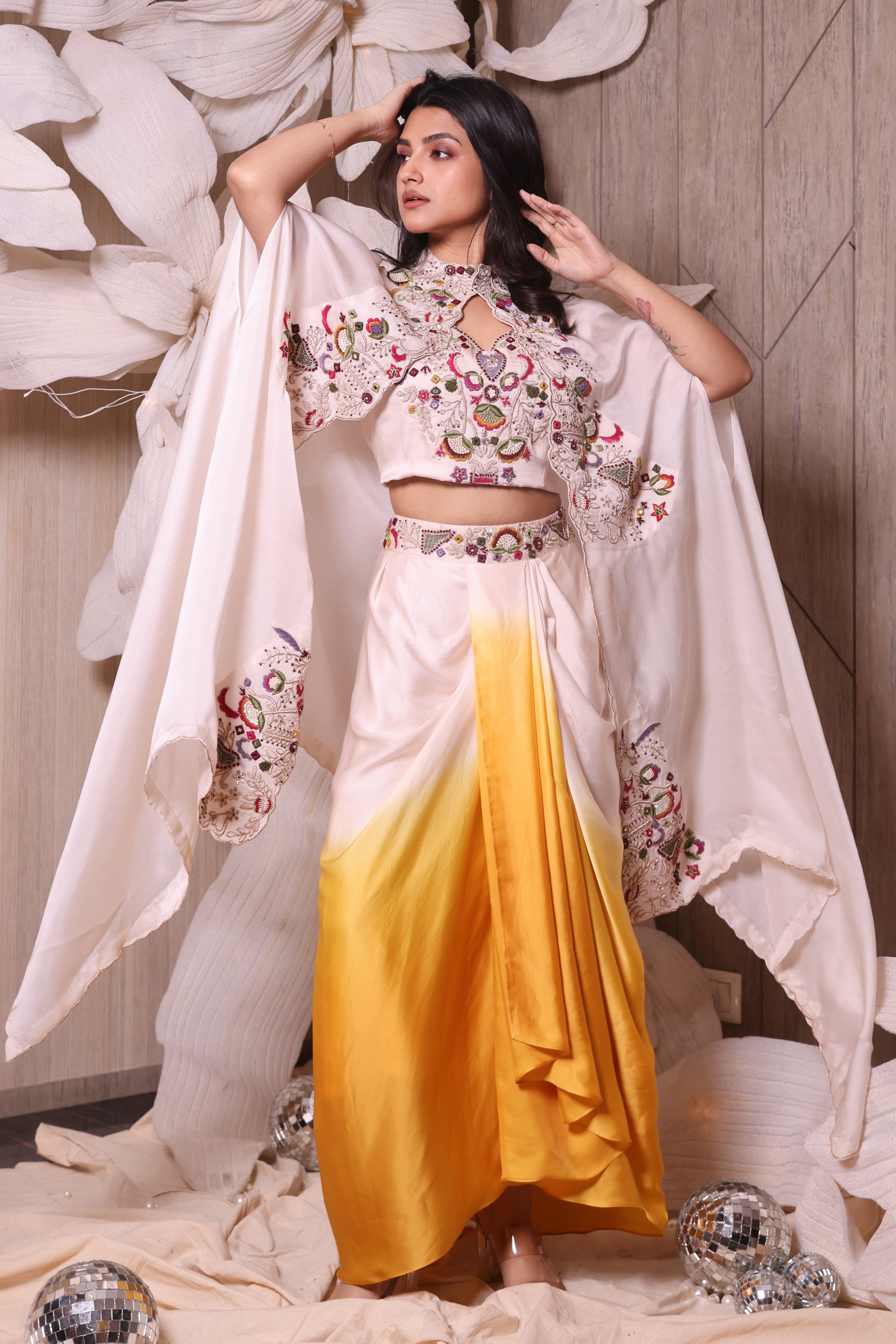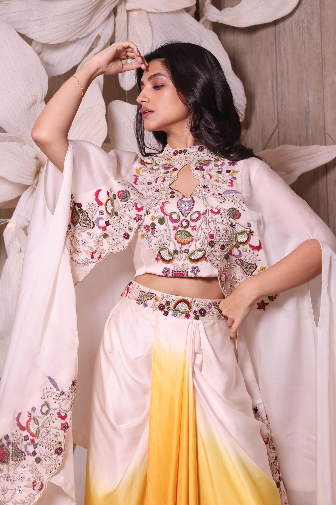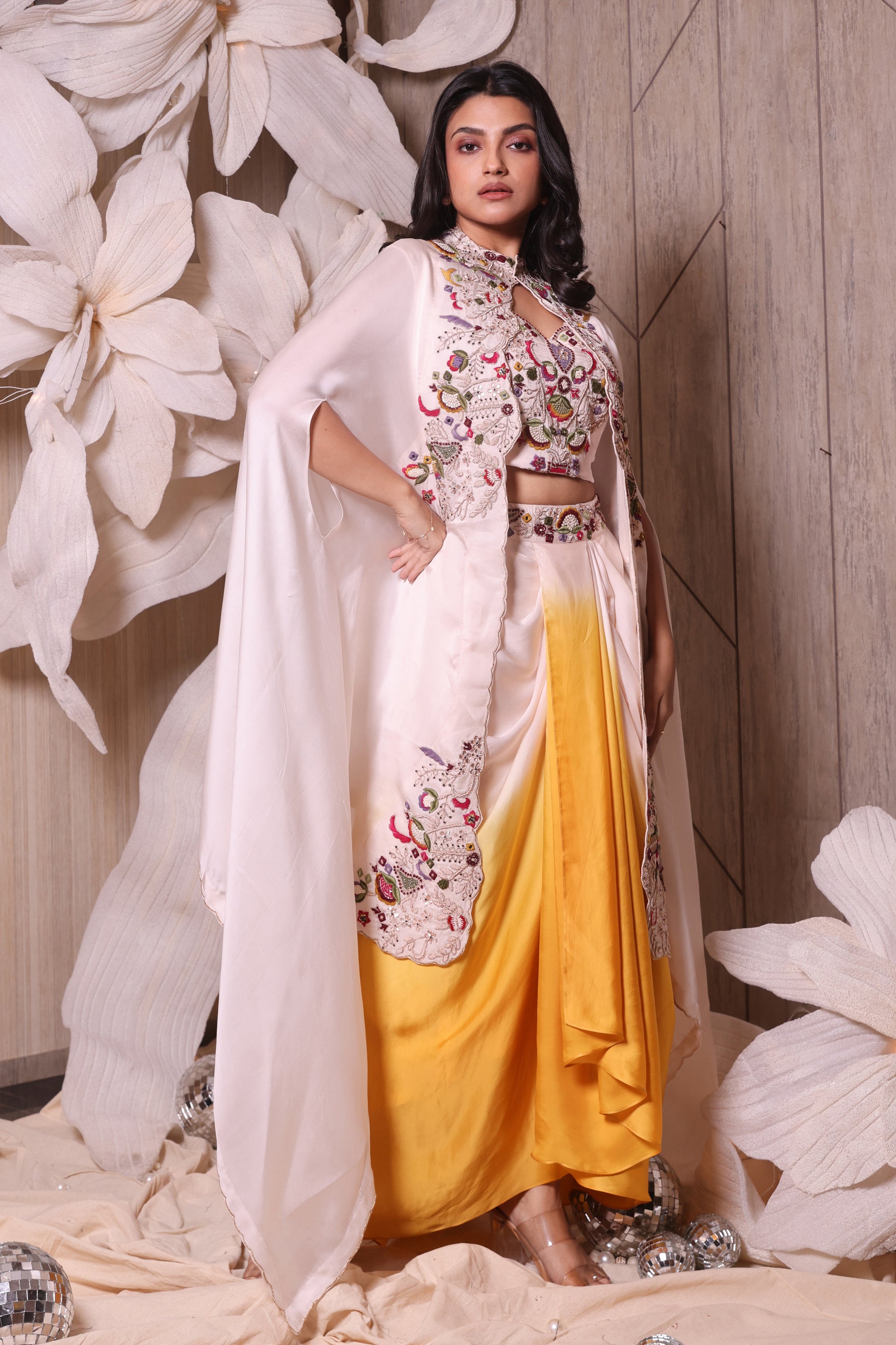 Graceful and contemporary, this three-piece ensemble featuring a cape, drape skirt, and bustier is perfect for occasions that call for modern elegance with a traditional twist.