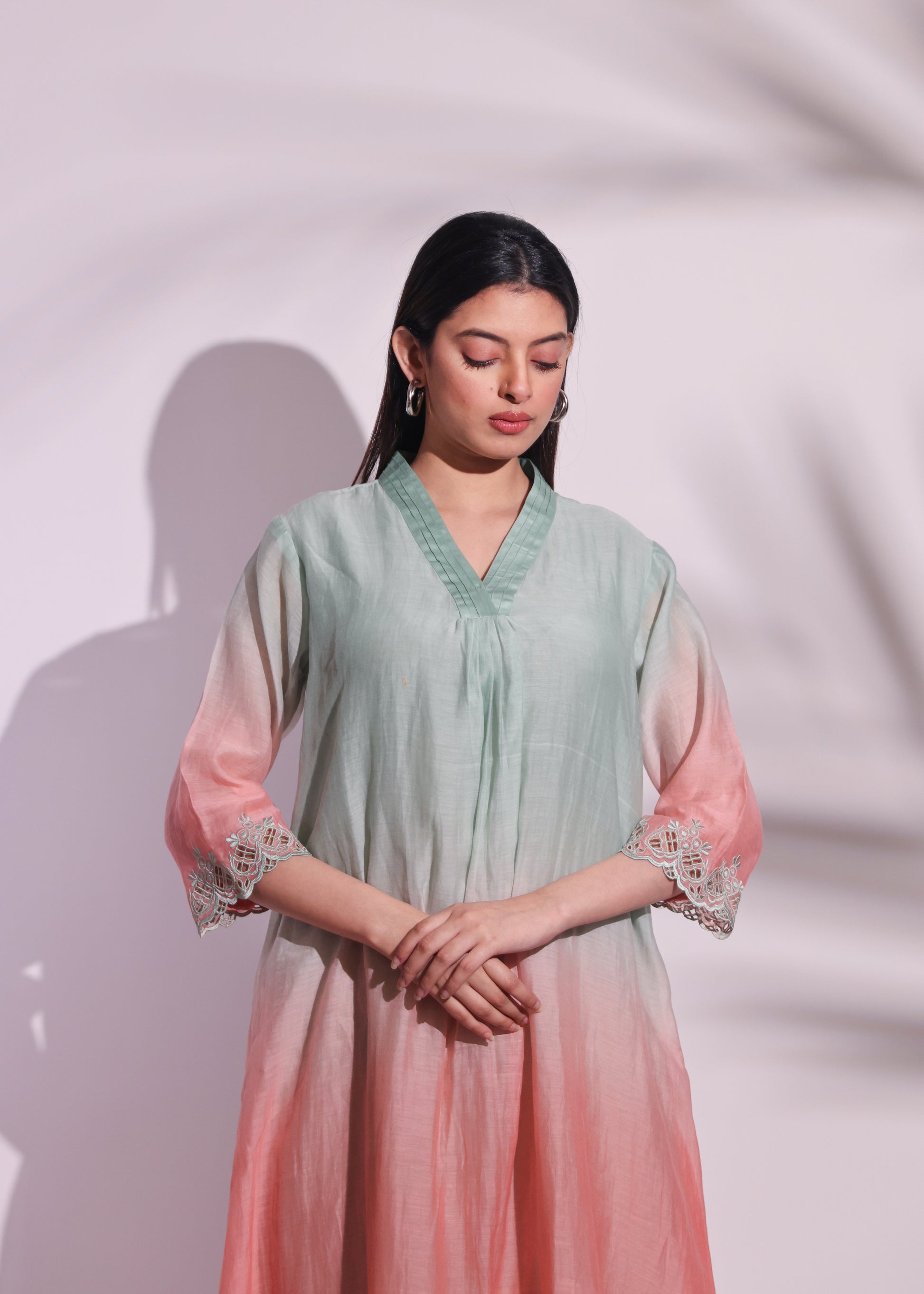 OMBRE PEACH GREEN TUNIC SET WITH EMBROIDERED SLEEVES
