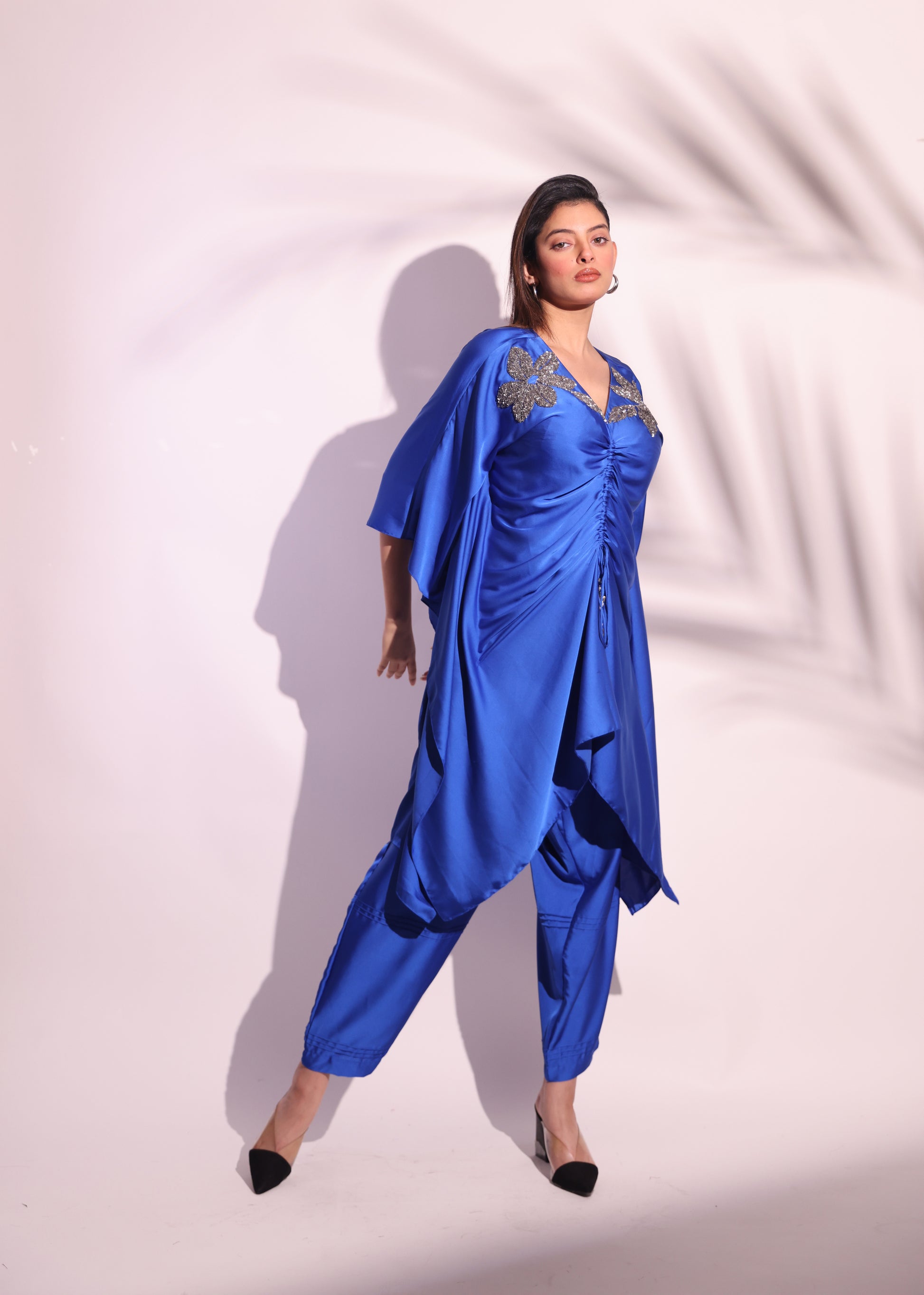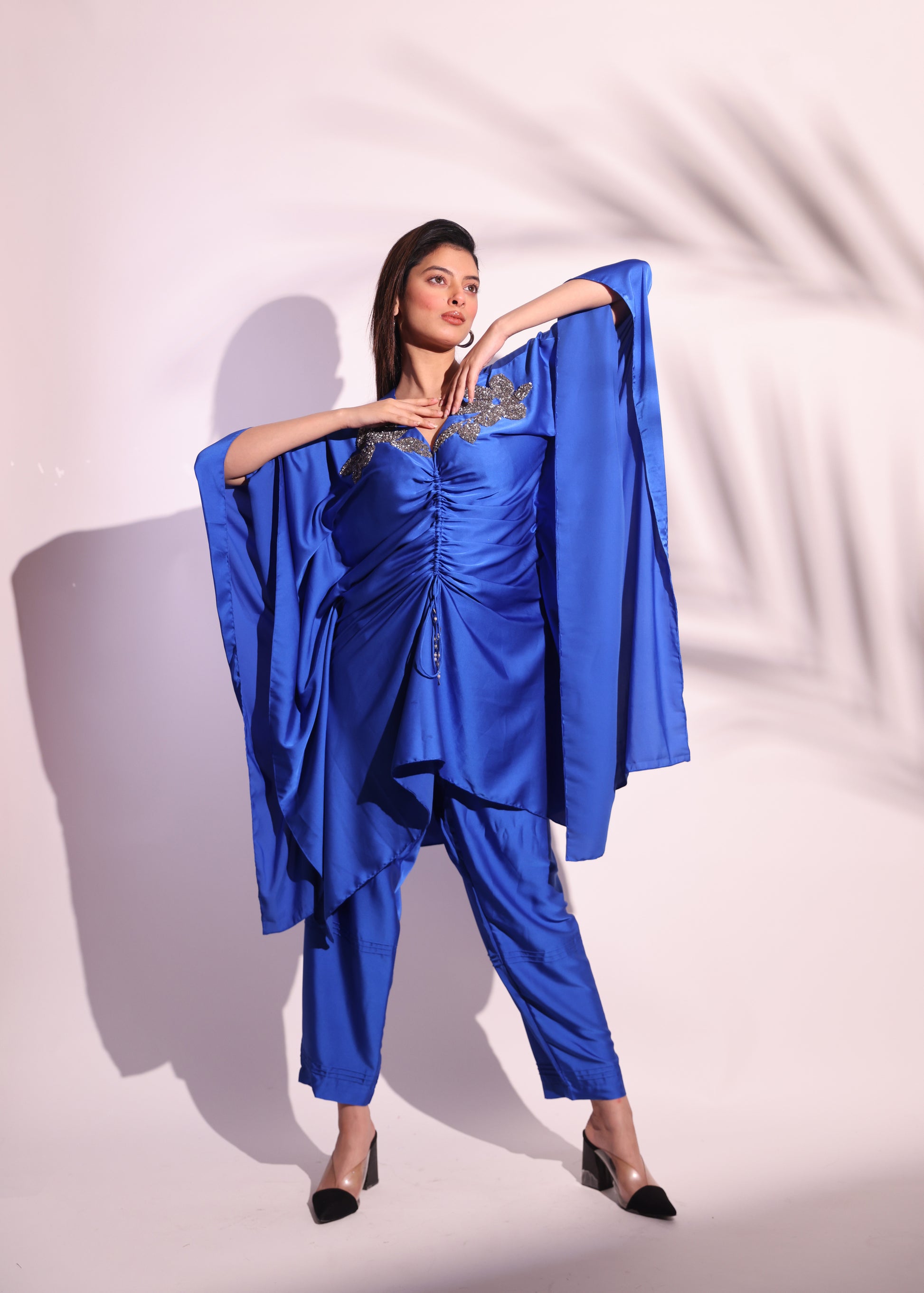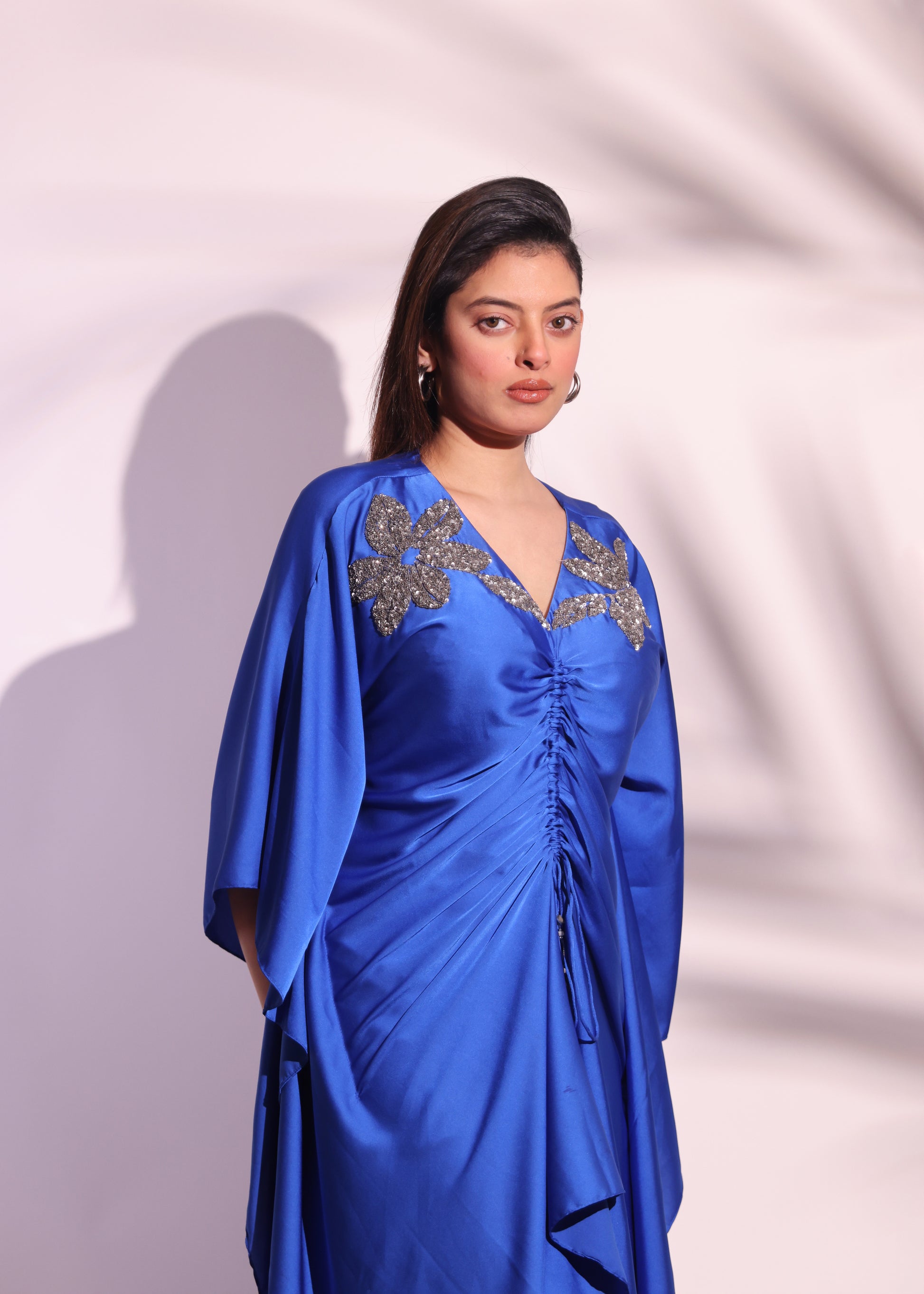 ROYAL BLUE GATHERED KAFTAN SET WITH FLORAL EMBROIDERY