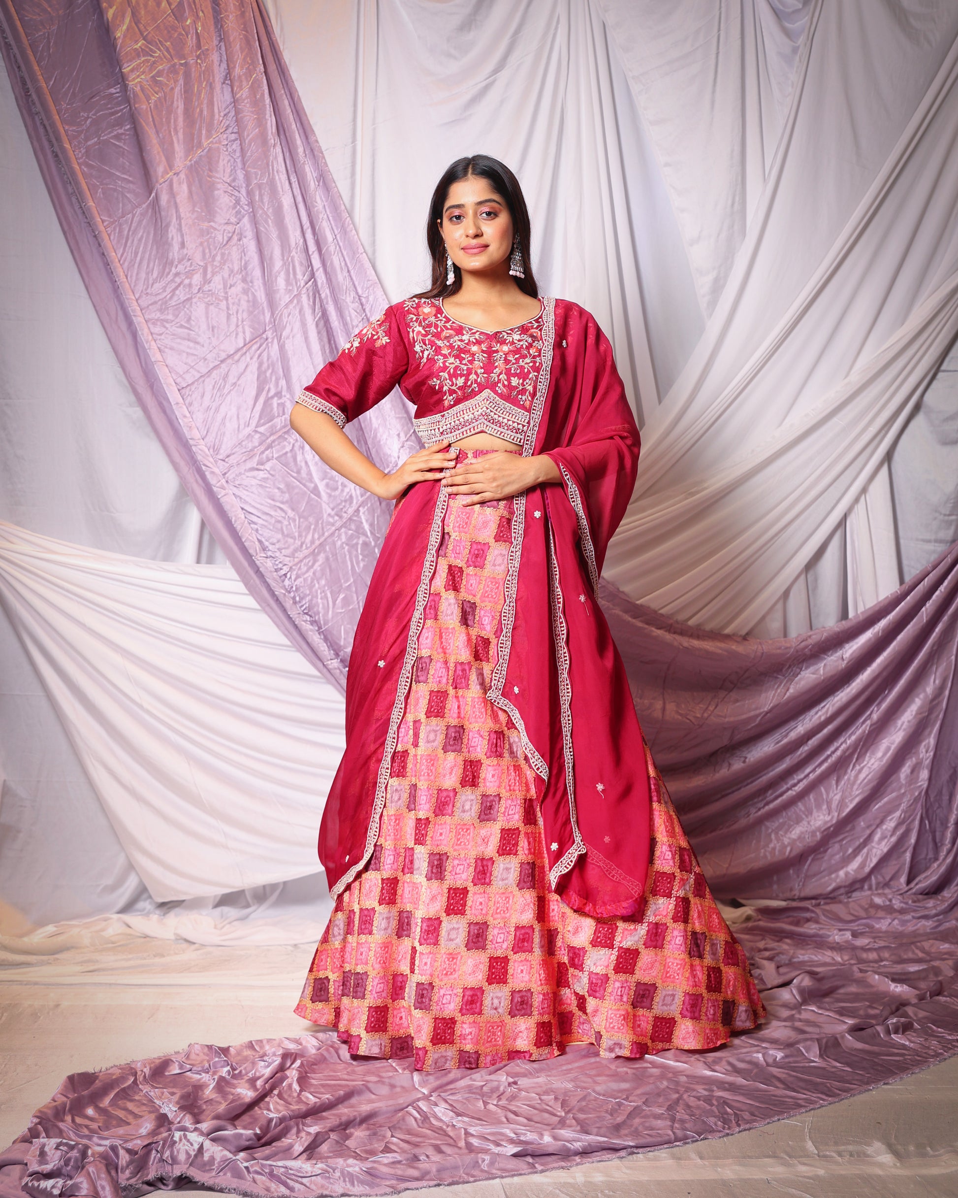 - Fabric: Crafted from luxurious organza, dola silk, and Banarasi fabric, chosen for their opulent textures and rich aesthetics, ensuring a regal and majestic look that commands attention.