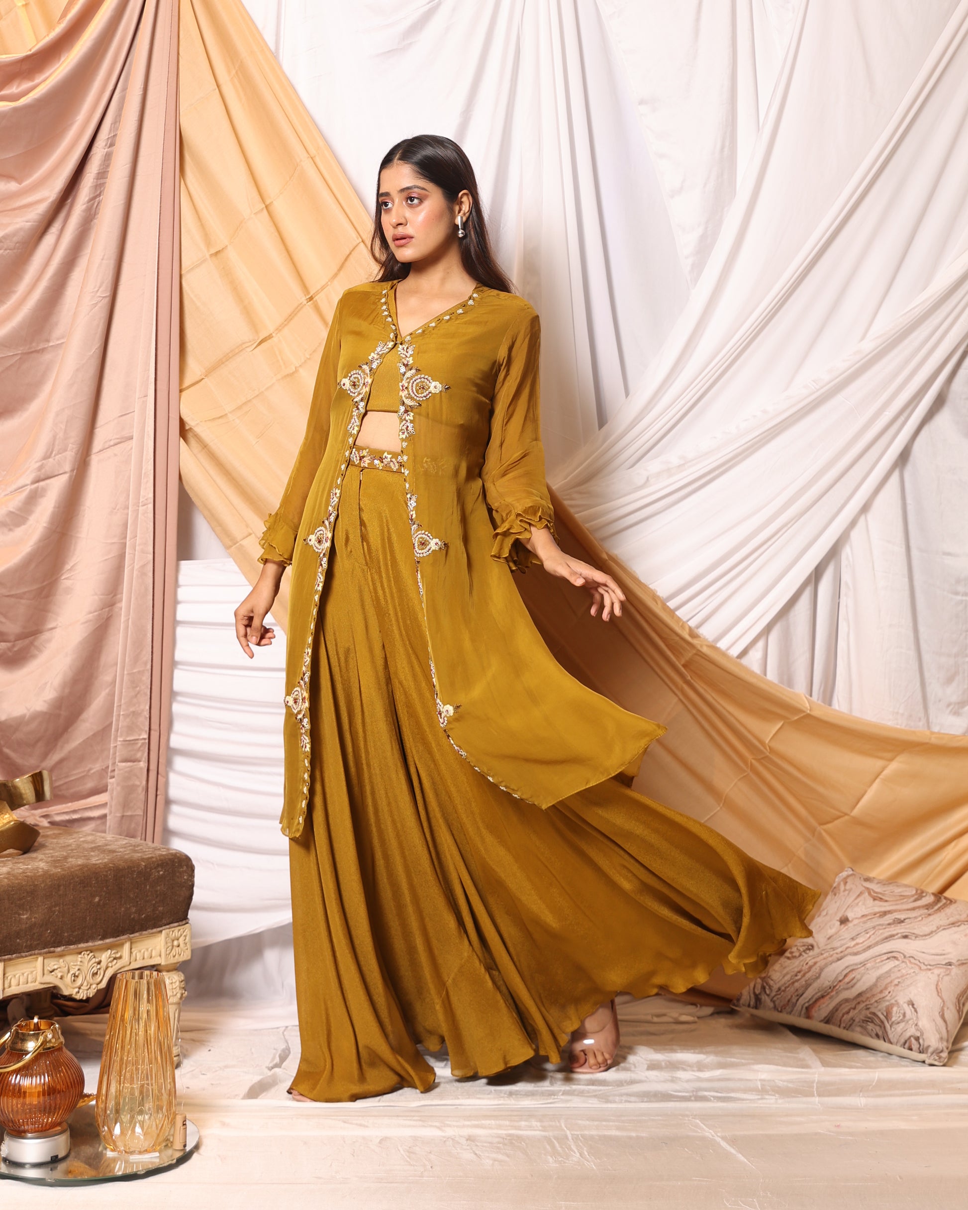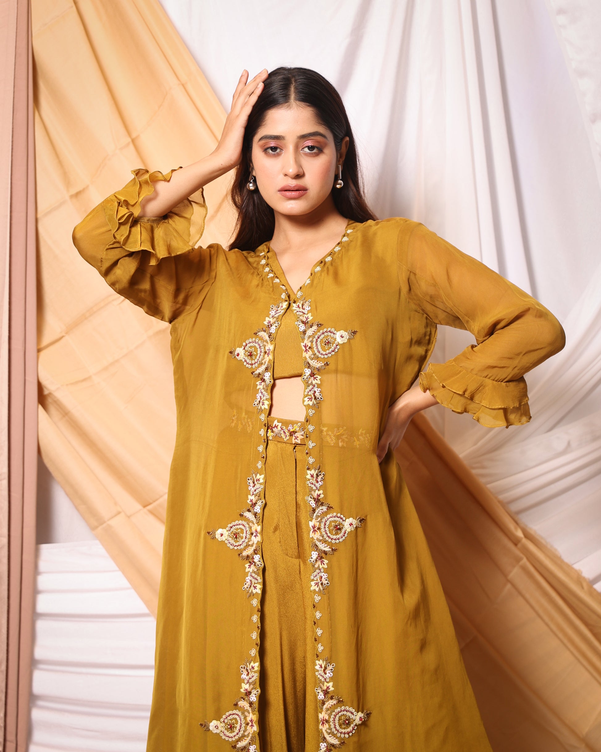 Make a Statement with Our Yellow Ochre Embroidered Jacket, Bustier, and Palazzo Pants Set Today!