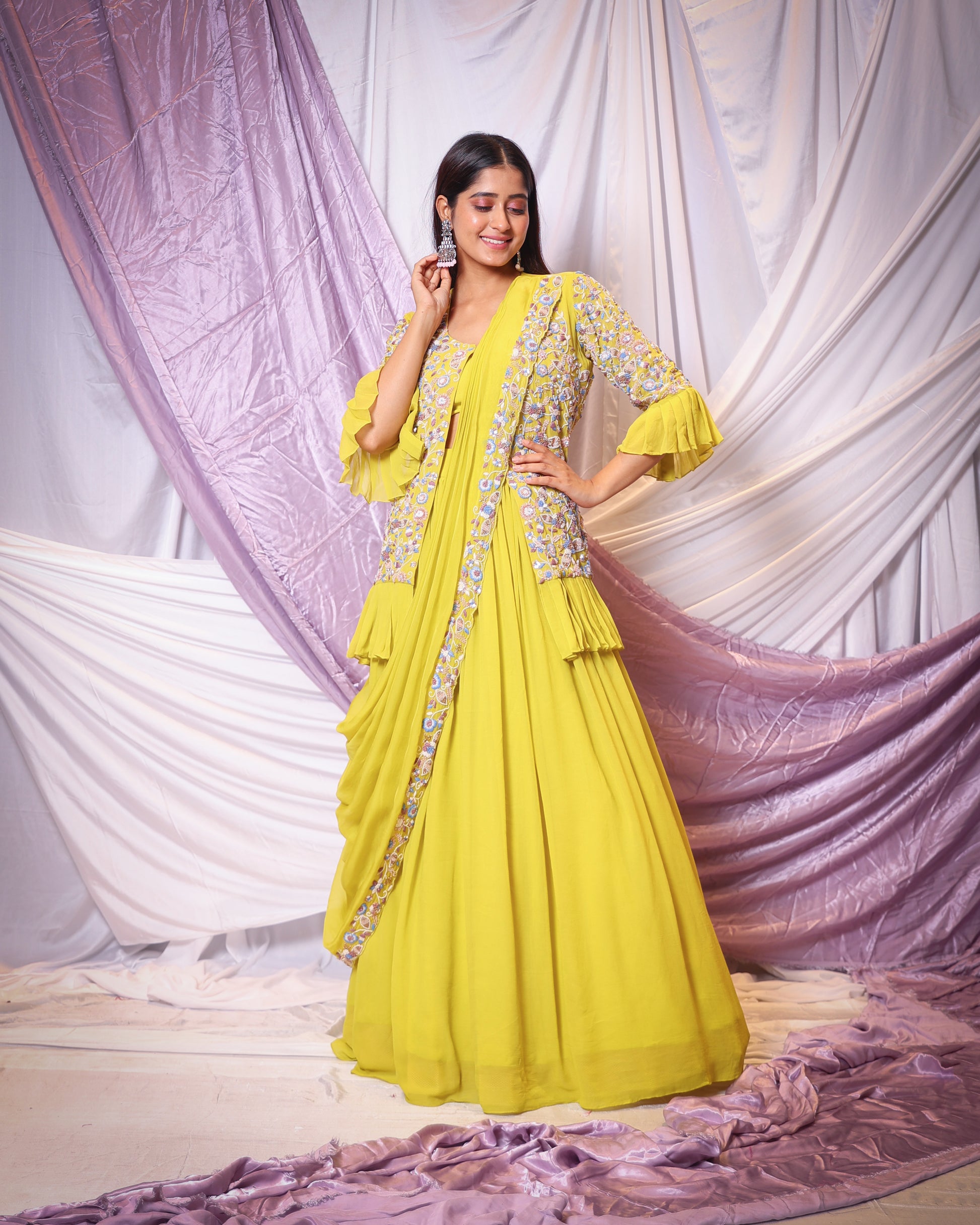ZARDOSI THREAD WORK JACKET WITH DRAPED GATHERED SKIRT