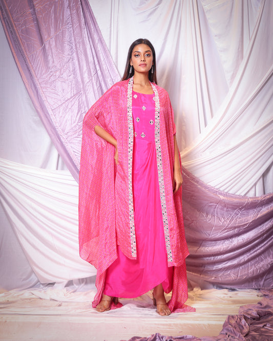BANDHEJ PRINT CAPE AND MIRROR-WORK DRAPED GOWN