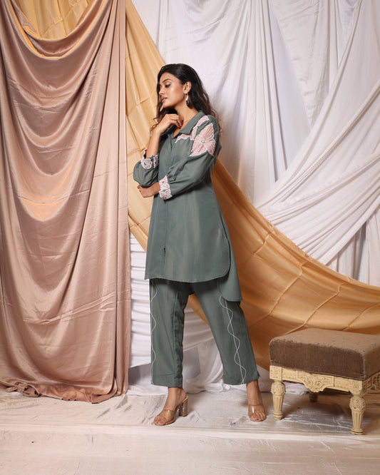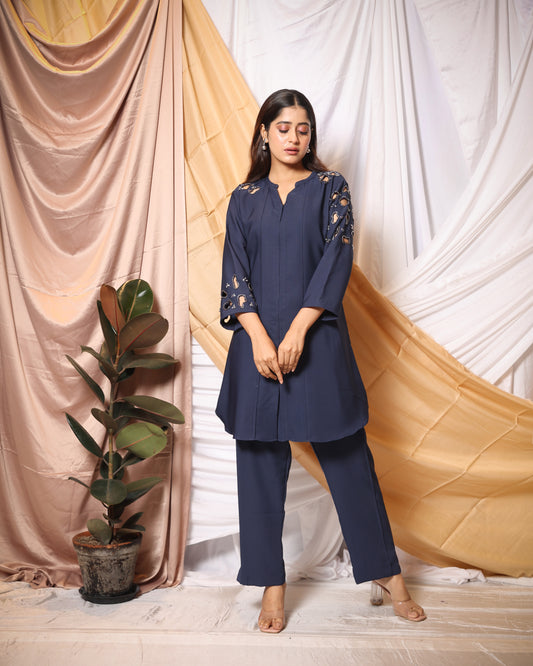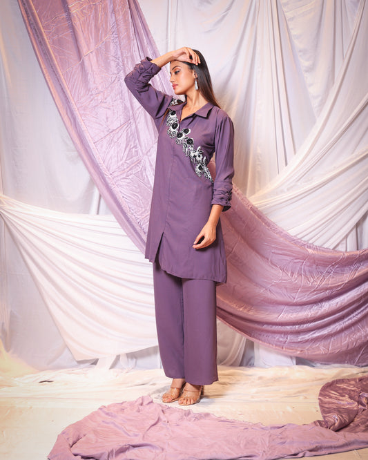 APPLIC WORK FLOWERS ON SHIRT- STYLE TUNIC AND PANT CO-ORD SET