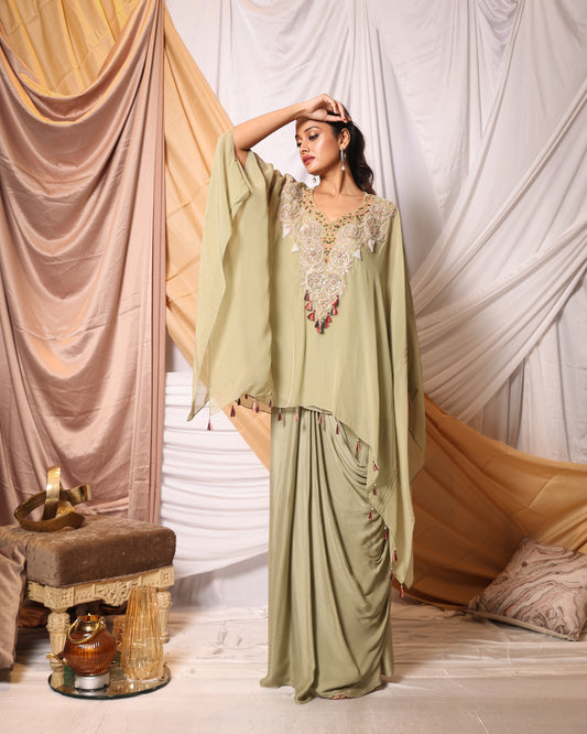 ARRI HAND YOLK WORK KAFTAN-STYLE CAPE AND DRAPED SKIRT SET