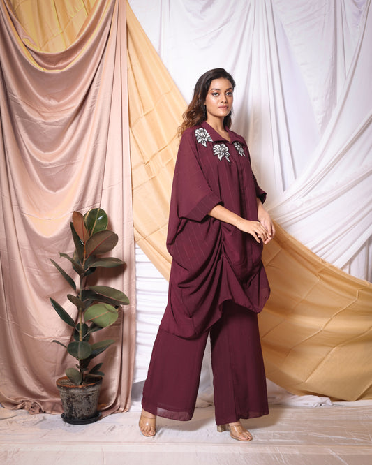 APPLIC FLOWER PATTERN DRAPED TUNIC AND PANT CO-ORD SET
